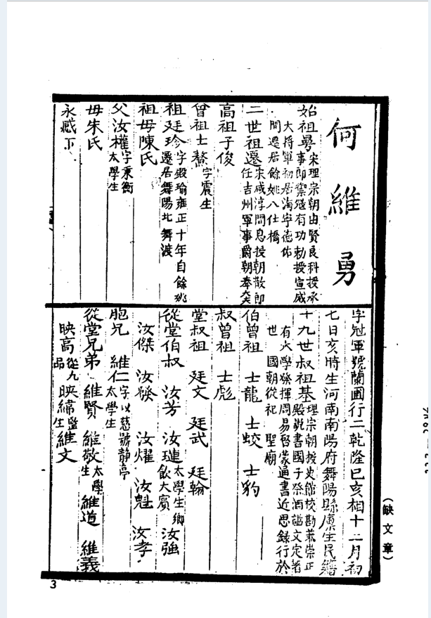 一、履 历:登本人姓名、字号、排行、出生年月、藉贯、撰述、行谊,并载本族谱系,最简为祖妣三代。亦有上自始祖下至子女、同族尊长、兄弟侄辈以及母系、 妻系无不载入。凡有科名、官阶、封典,著作亦注入名下。再录师承传授, 如受业师、问业师、受知师之姓名、字号、科名、官阶以示学问渊源有自。